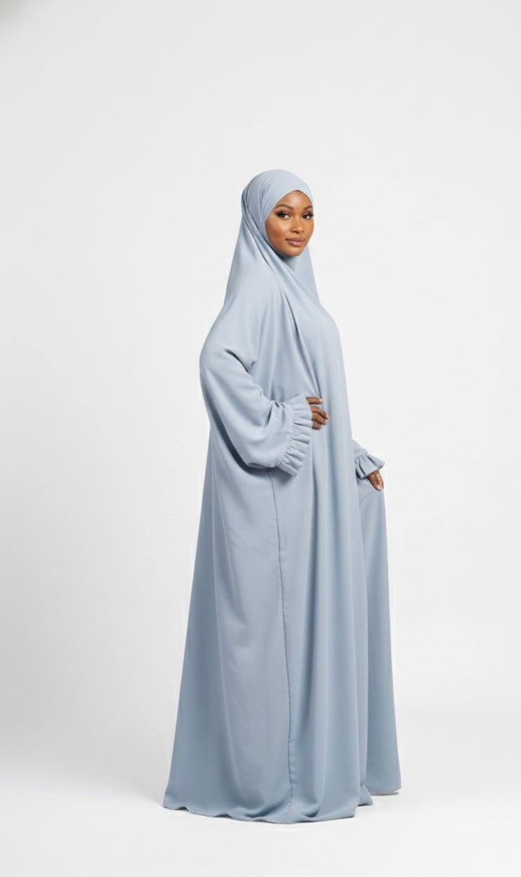This one-piece jilbab provides full-length coverage with a simple, elegant silhouette. Designed for daily wear or prayer, it features an integrated headpiece and a wide, flowing fit for maximum comfort.